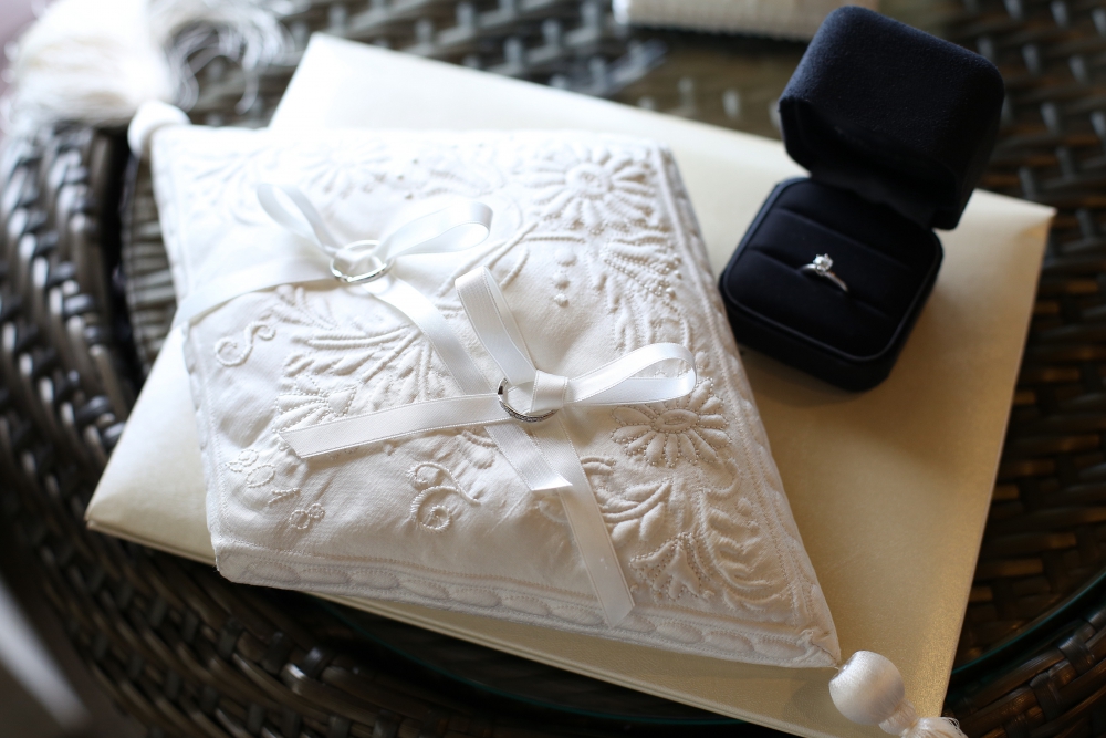 新婦母お手製のリングピローで指輪の交換を行いました。