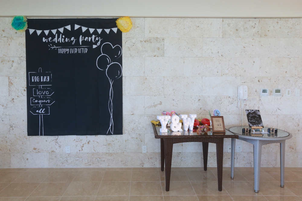 ゲスト控室内のフォトブース。待ち時間も楽しんでいただきたくて作りました。