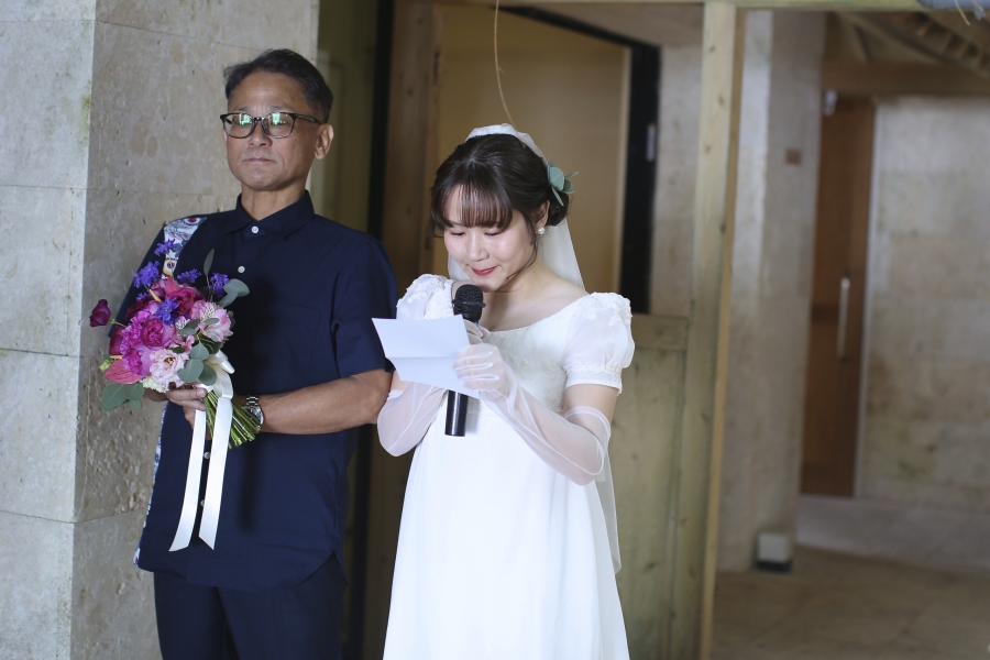 私達は職業柄脇役になることが多く、当日の朝までゲストの方々が楽しんでくれるかどうか不安で眠れませんでしたが、先に会場に到着していた親族の楽しそうな様子を目にしたり、入場の前に満面の笑顔で手を振ってくれた友人達を見て、「みんなが楽しんでくれている!私たちも主役になっていいんだ!」と思い、自然と涙が溢れてきました。