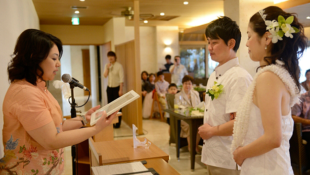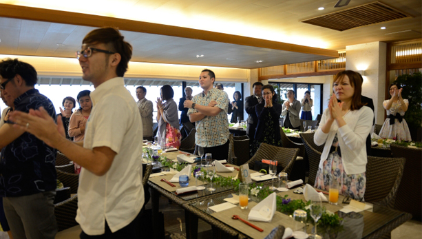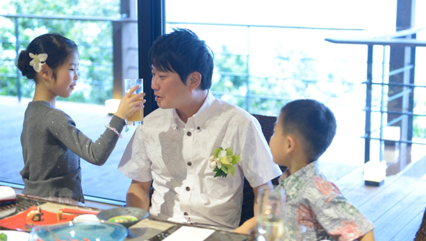 結婚式をすると決めた時から、東京の親族(新郎側)と沖縄の親族(新婦側)が仲良くなれるパーティーにしたいと願っていました。その希望通りにアットホームなパーティーになったと思います。東京から来た親族からは、沖縄らしい海と空の見える風景、琉球舞踊の演出、そして沖縄の食材を使い器にもこだわった美味しい食事に、数多くの好評の言葉をもらいました。準備段階から細やかで丁寧に対応していただいたおかげと感謝しています。ありがとうございました!